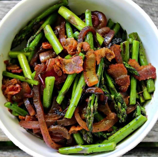 Olive~Me & Co.’s Pan Roasted Asparagus with Red Onion and Bacon