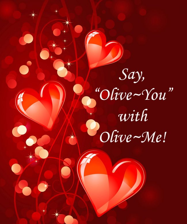 Valentine’s Day is coming.  What better way to say “Olive you” than with Olive~Me! Instead of a buying box of chocolate covered cherries this year, why not blend our Chocolate and Cherry Balsamic vinegars? How about blending our Chocolate Balsamic with our Caramel Balsamic for a spin on the classic? Or maybe try our…