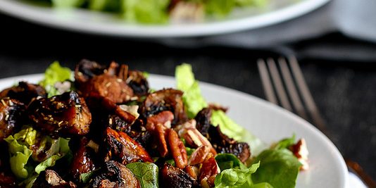 - Place the romaine lettuce in a large bowl and combine with the roasted mushrooms, toasted pecans and dressing. Toss to coat and divide between 2 plates. Serve.