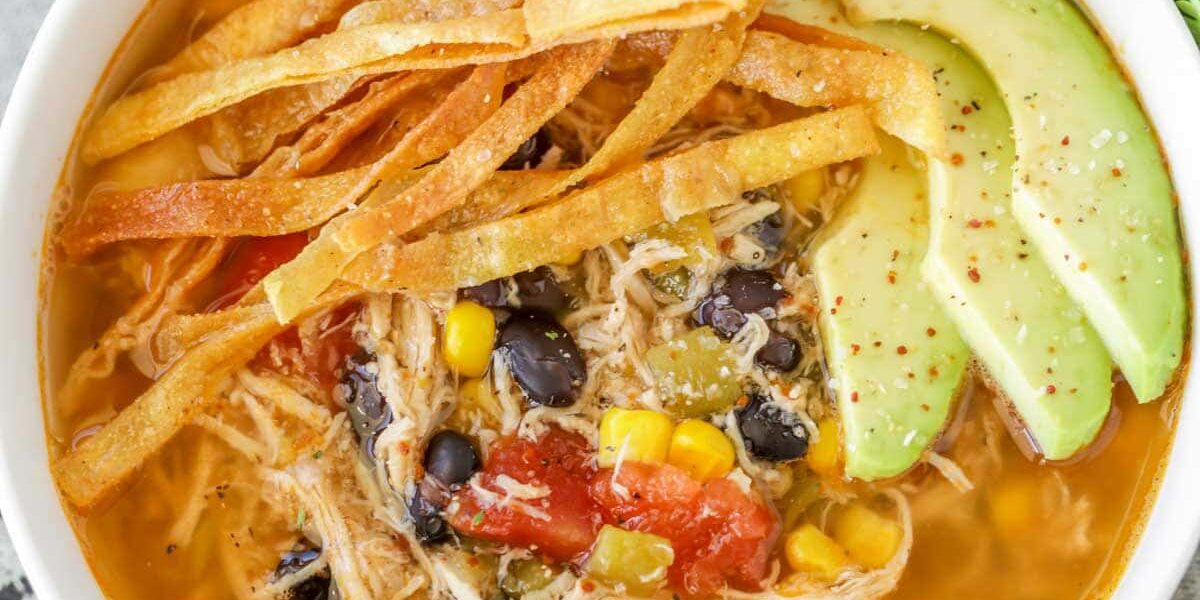 - Serve in bowls, garnish with shredded cheddar cheese, avocado and tortilla strips.