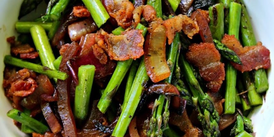 - Transfer asparagus to dish and top with onion and sprinkle with bacon.
