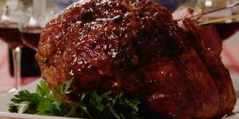 - Remove the ham from the oven and baste generously with the glaze, using about 1/4 of the glaze. Continue to roast the ham until it is deep brown and glazed, brushing the ham with more glaze every 10 minutes or so. Use an average of 10 minutes cooking time per pound of ham. Transfer the ham to a large platter and let rest 10-15 minutes prior to slicing.