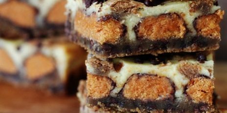 - Press 3/4 of cookie mixture into pan. Place Butterfinger bars side-by-side on top of cookie dough. Pour cheesecake mixture on top. Crumble remaining cookie dough and sprinkle on top of cheesecake layer. Sprinkle chocolate chips all over top.