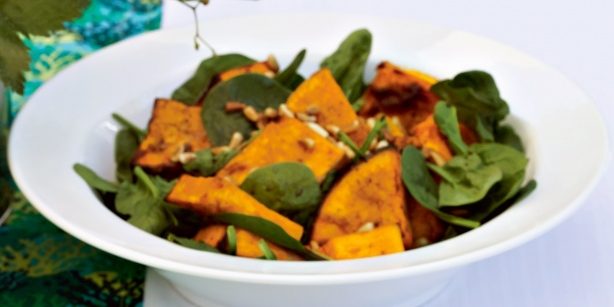 - Place spinach and pumpkin in a large bowl. Sprinkle with pine nuts. Drizzle with dressing. Season with salt and pepper. Serve.