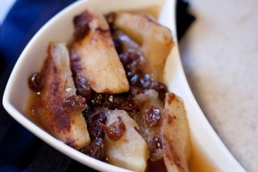 Serves: 4-6 Ingredients: 6 Large tart apples, cored, sliced and peeled (peel on is okay too) 1 cup golden raisins 1cup granulated sugar ¼…