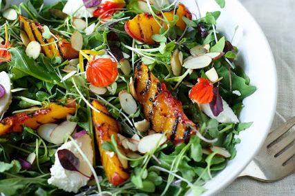 Ingredients: 3 peaches 6 oz arugula mild sheep’s milk cheese, chèvre, fresh goat cheese, or fresh mozzarella 1/8 cup almonds, toasted and slivered Purple basil…
