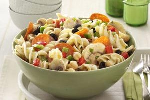 12-16 servings Ingredients 1 package (16 ounces) spiral pasta 1 can (15 ounces) garbanzo beans or chickpeas, rinsed and drained 1 package (3-1/2 ounces) sliced…