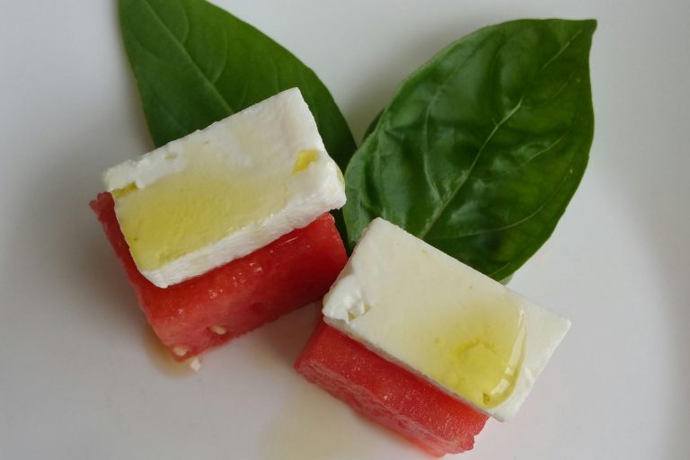 INGREDIENTS: 1/4 cup Olive~Me & Co.’s Basil olive oil watermelon, sliced into 1 inch cubes block of feta cheese, cut into ¼ inch cubes…